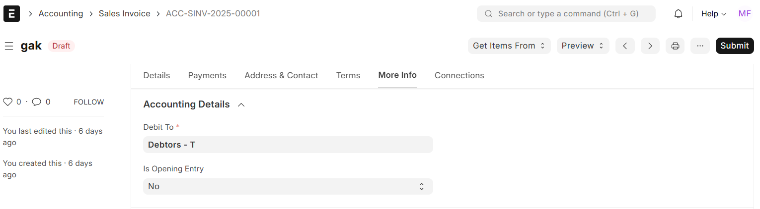It is applied when price variations, additional fees, or mistakes in the initial invoice become essential to raise the invoice value. ERPNext raises the invoice value, posts it as an added receivable in the customer ledger account, and considers it a debit note while it is chosen to support proper financial and tax documentation.