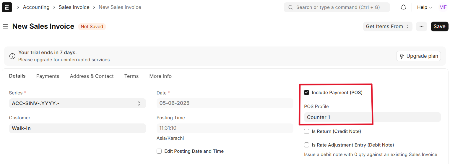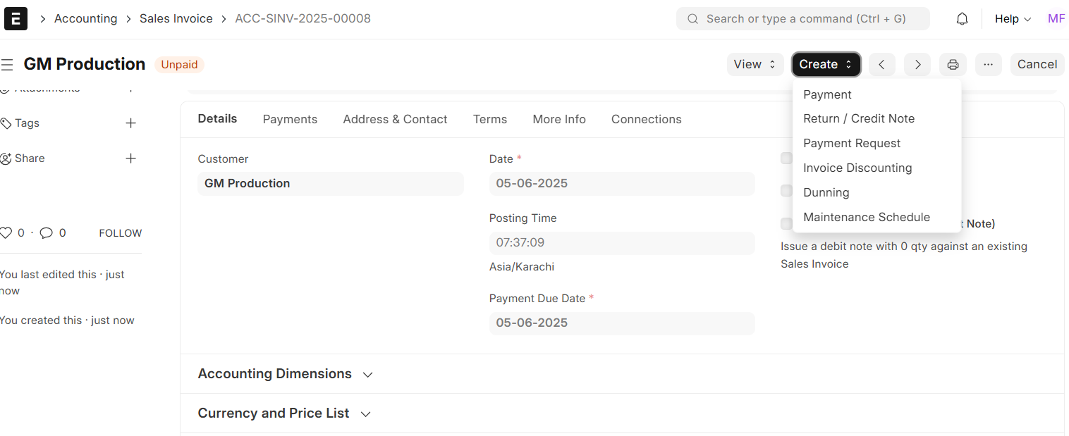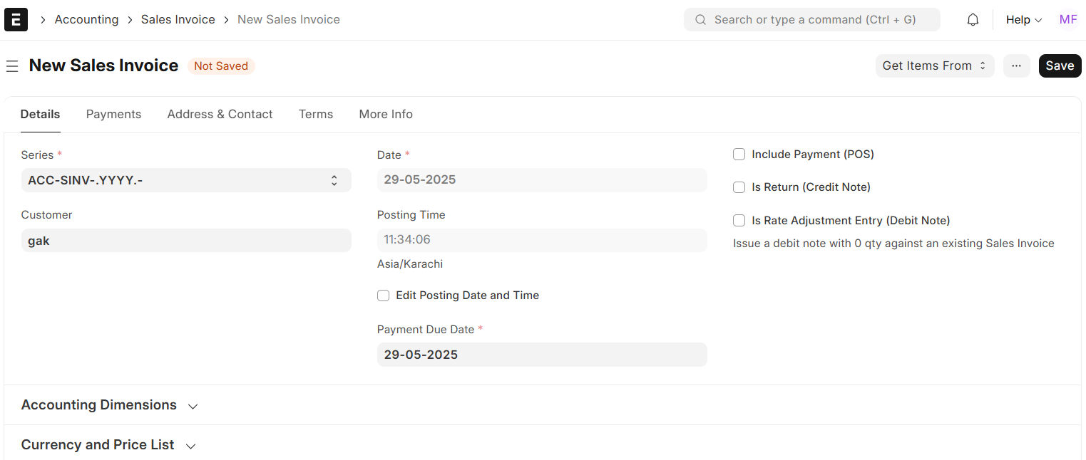 While creating a sales invoice, ERPNext provides additional options based on the transaction type: