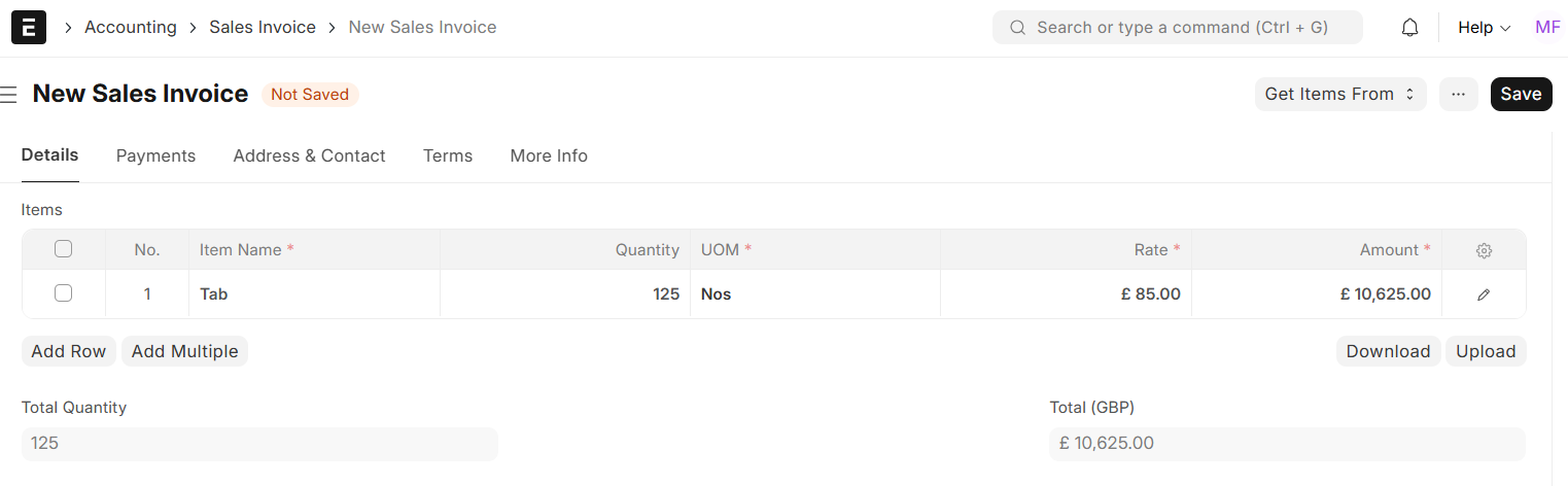 A sales invoice is raised from a sales order or a delivery note, as this automatically fetches the customer and item details into the sales invoice. Alternatively, it is also possible to create a sales invoice from scratch, for example, when recording a POS invoice.