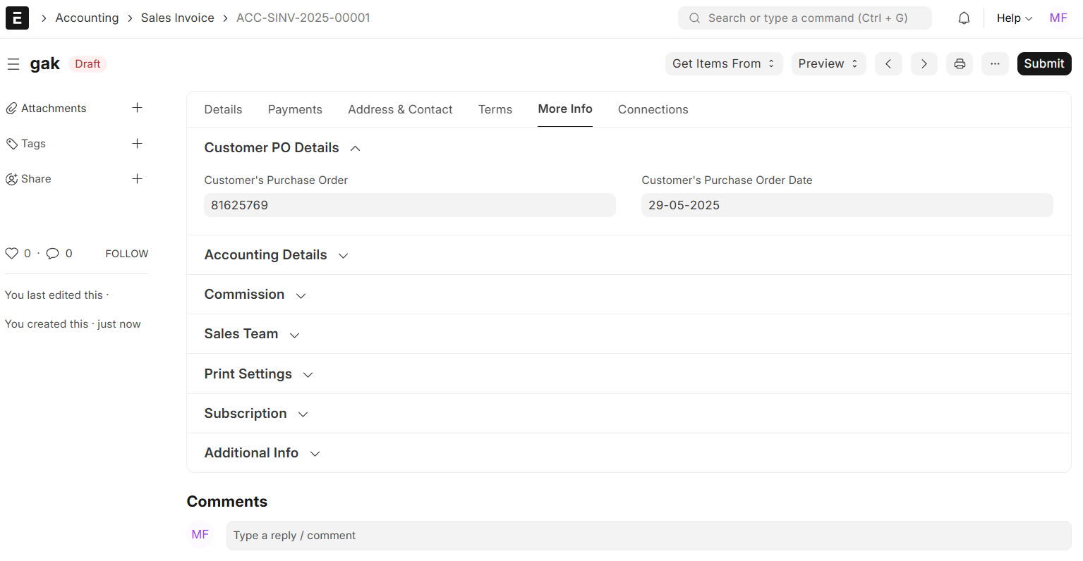 • ERPNext will automatically fill in the default information, such as the billing address and contact.