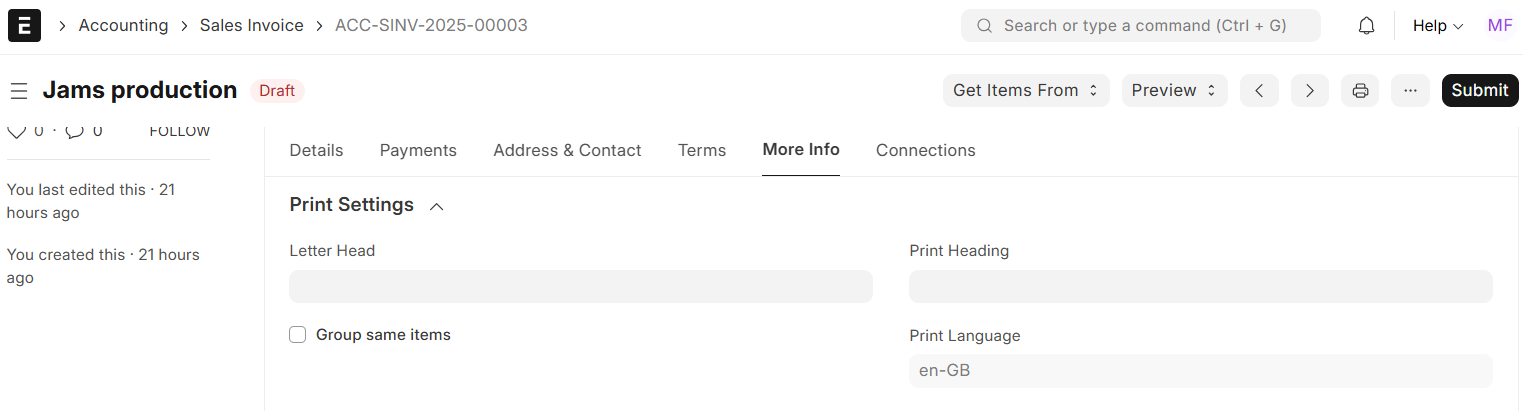 • Draft The invoice has been saved but has not been submitted. This invoice does not post to accounting or stock.
