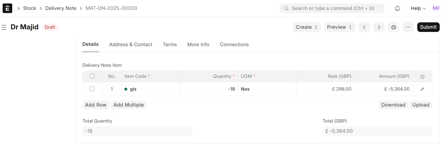 - Open the original delivery note/sales invoice against which the customer has returned the items.