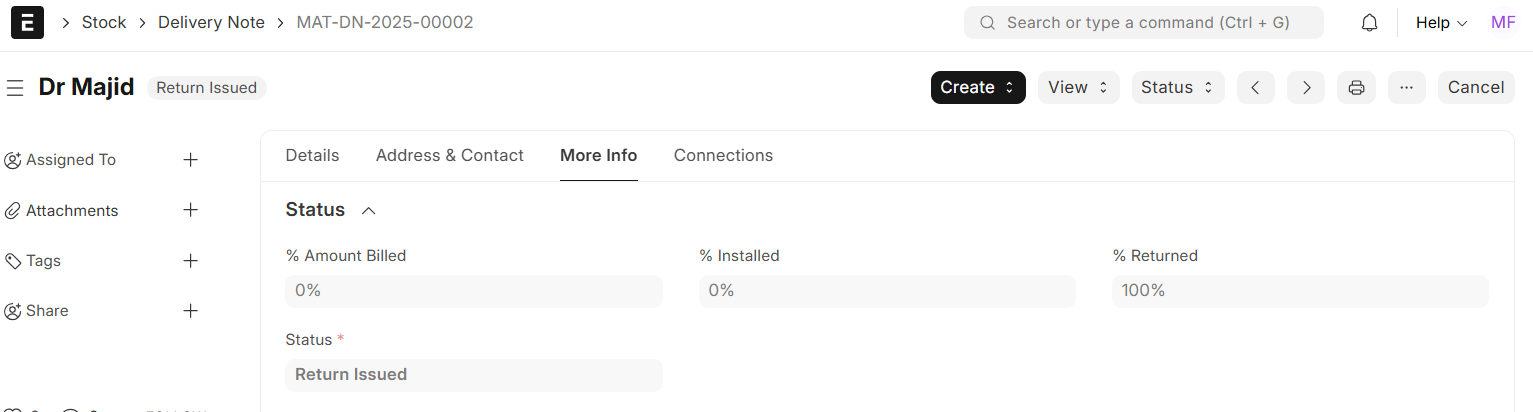 The status of the original Delivery Note is changed to Return Issued if 100% returned: