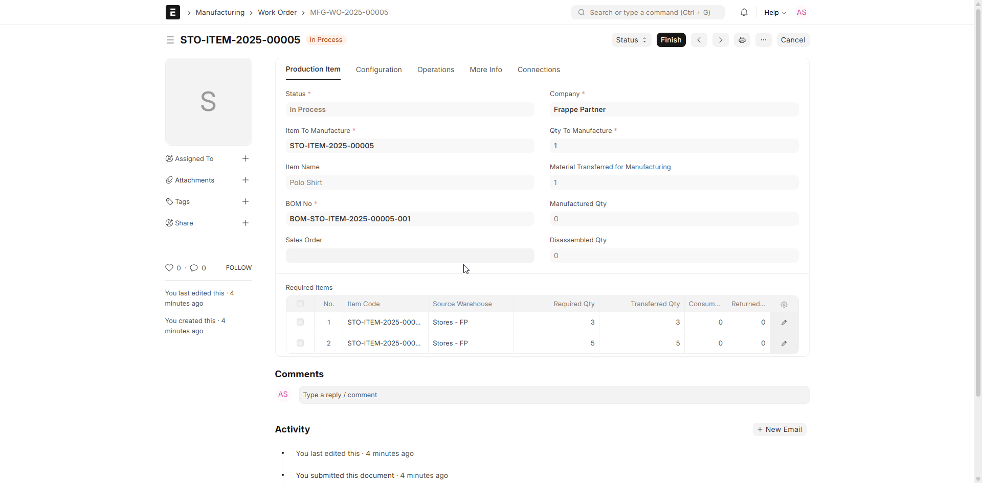 Upon completion of the production process, a Manufacture Entry (Stock Entry of type Manufacture) is posted against a Production Order.