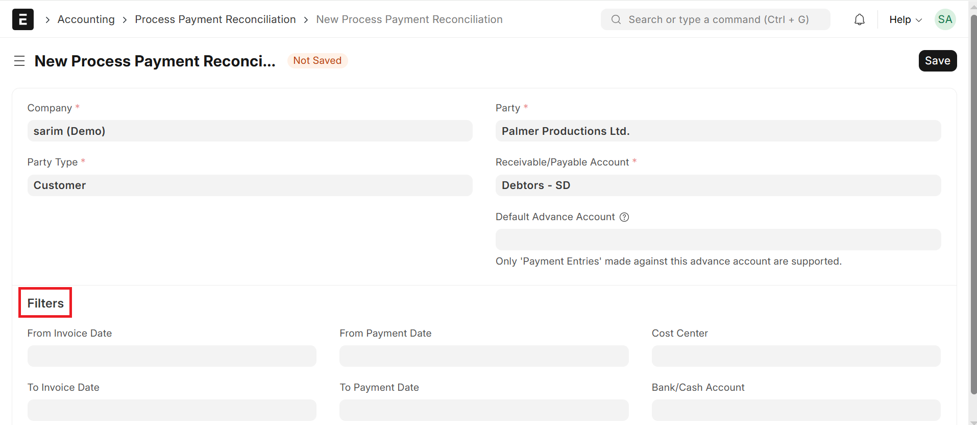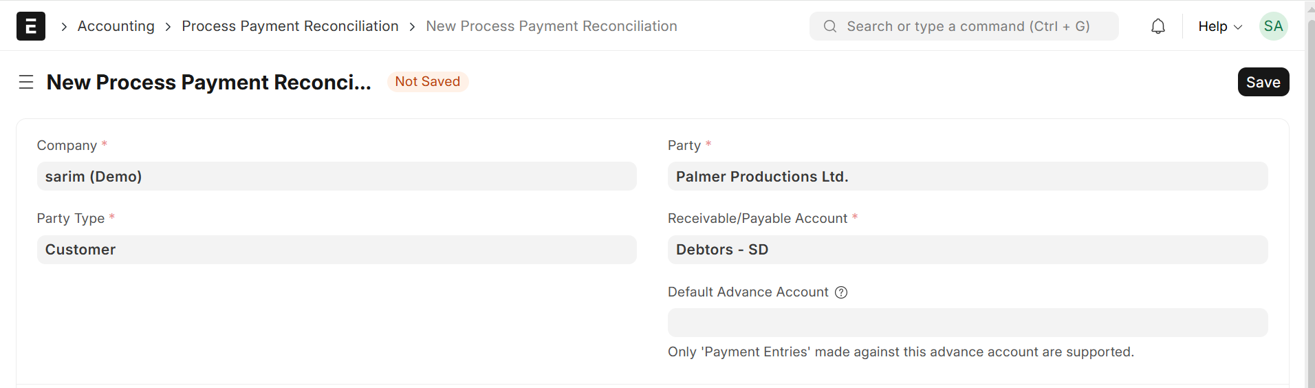 To perform a reconciliation, select the company, the party (supplier or customer), and the relevant payable or receivable account. Save the document, then submit it. This gathers all the data that the background job needs.