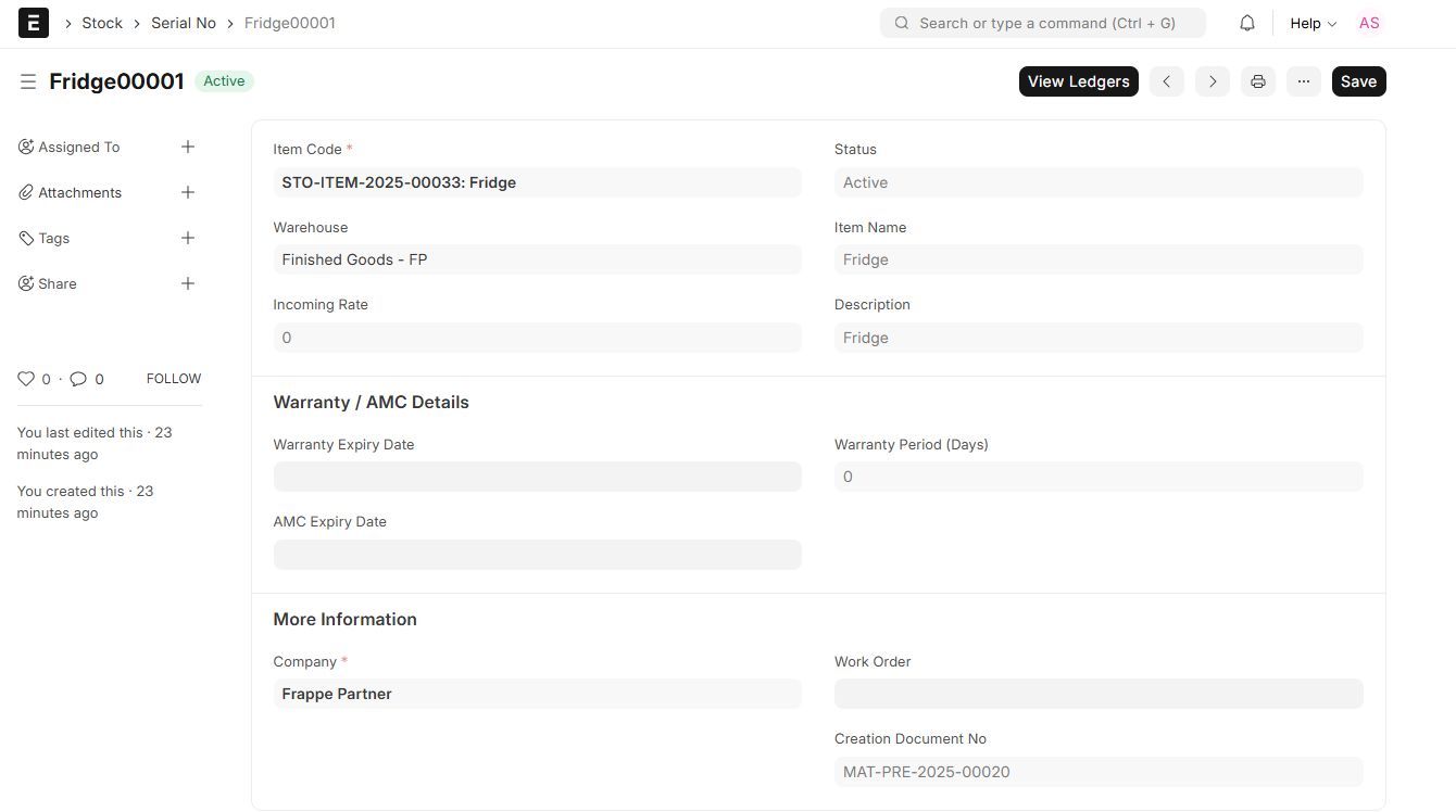 Example: If you get a serialized item via a Stock Entry, ERPNext will automatically generate distinct Serial Numbers such as “Fridge.00001”, “Fridge.00002”, etc., and associate them with the transaction and warehouse.
