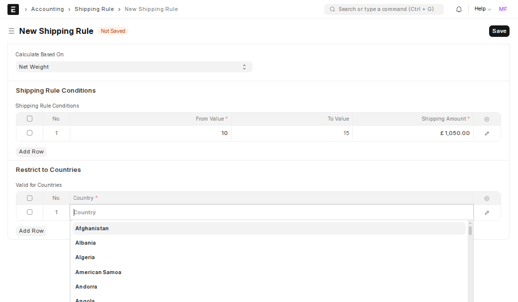 When you select “Net Total” or “Net Weight” under the “Calculate Based On” field, a table will appear allowing you to define range-based slabs.