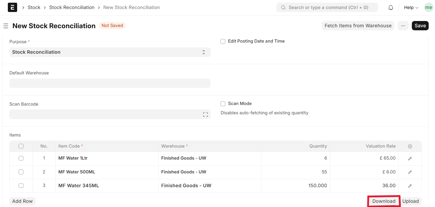 - Start a new Stock Reconciliation.
