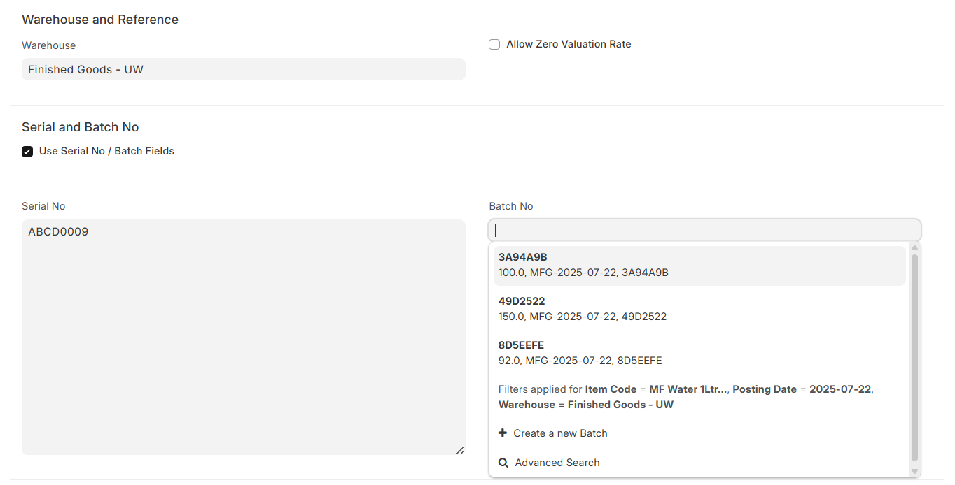 - Reconcile All Serial Nos / Batches: Auto-loads all existing