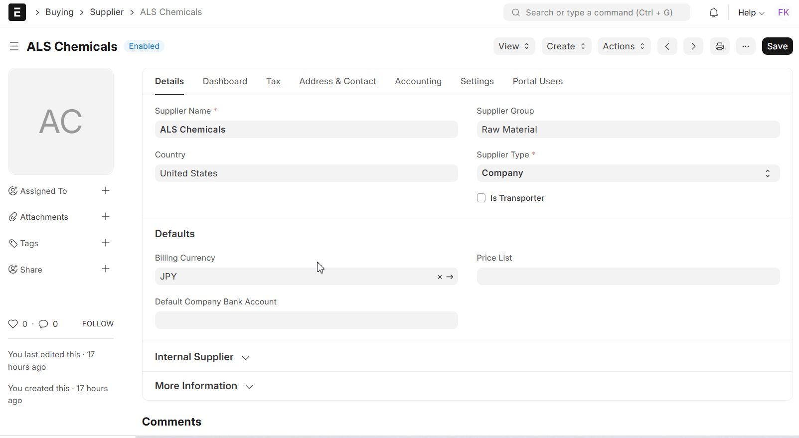 Billing Currency: A supplier’s billing currency may vary from your company’s base currency. If you define the supplier’s billing currency (for example, JPY), ERPNext automatically uses that currency for future purchase transactions with the supplier. The system also shows the corresponding exchange rate, providing accurate accounting and reporting.