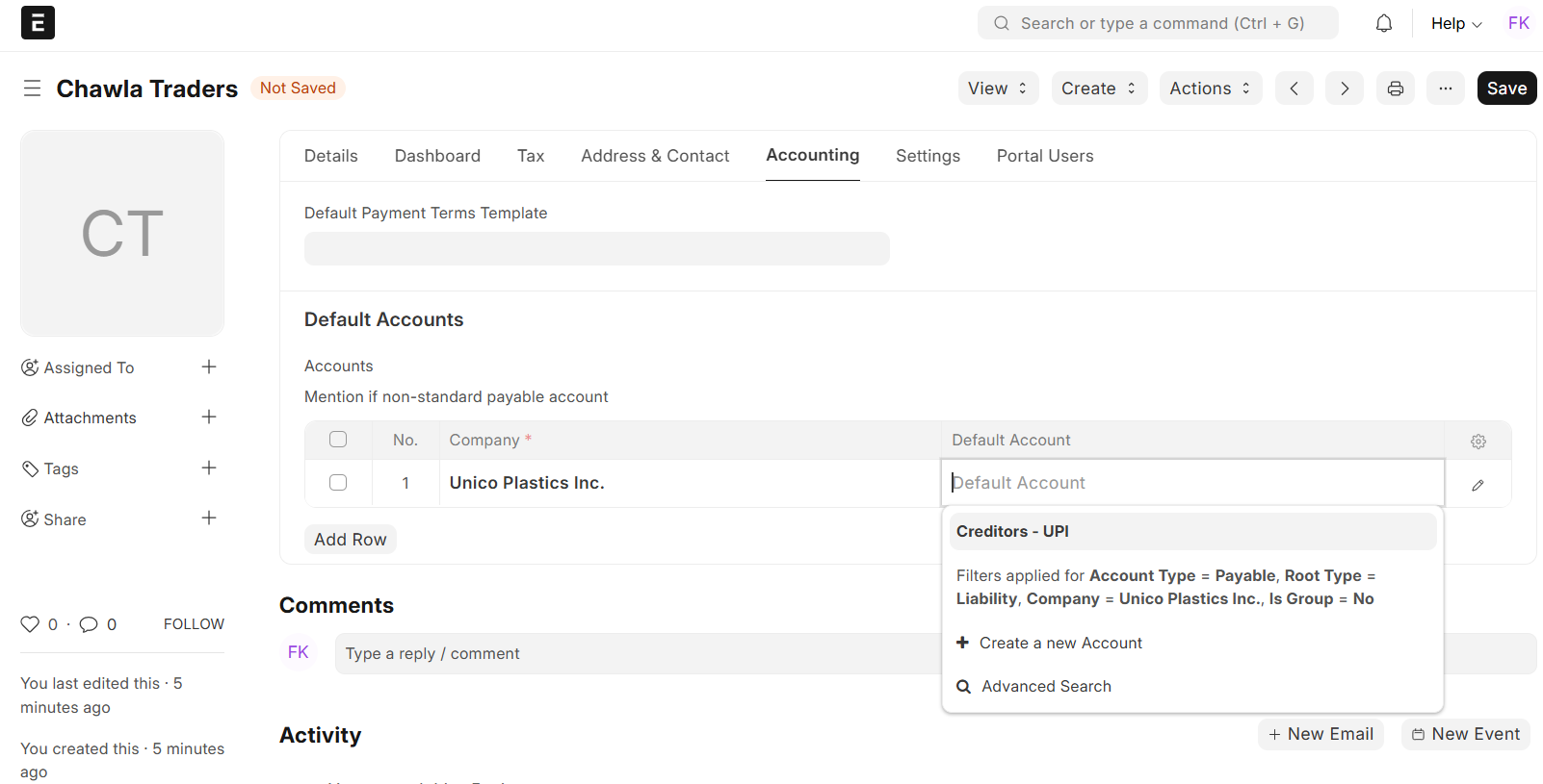 - If you don’t customize the account, ERPNext will keep using the default “Creditors” account by default.