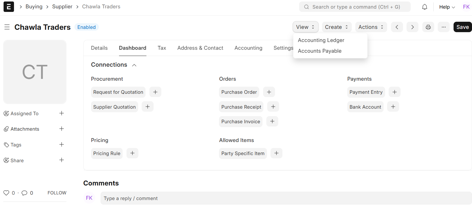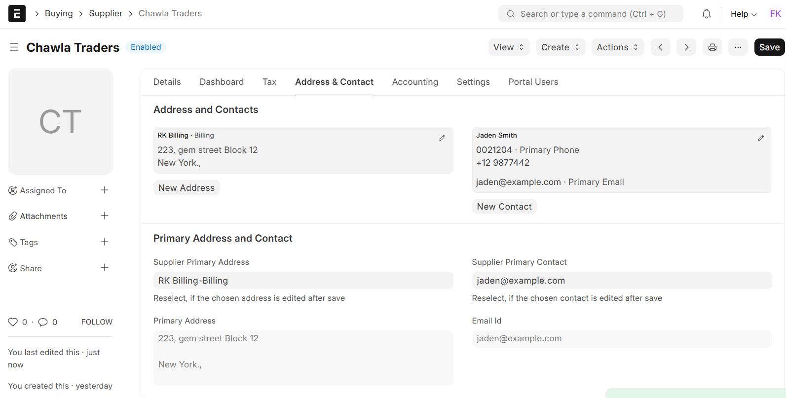 - You will notice the possibility of creating or referencing Addresses and Contacts right from the Supplier dashboard.