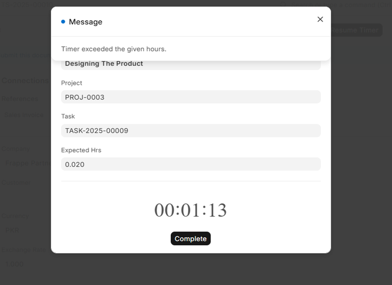 - If there is a timer running and the time elapsed is more than the Expected Hours, an overrun alert will be shown in order to alert the user.