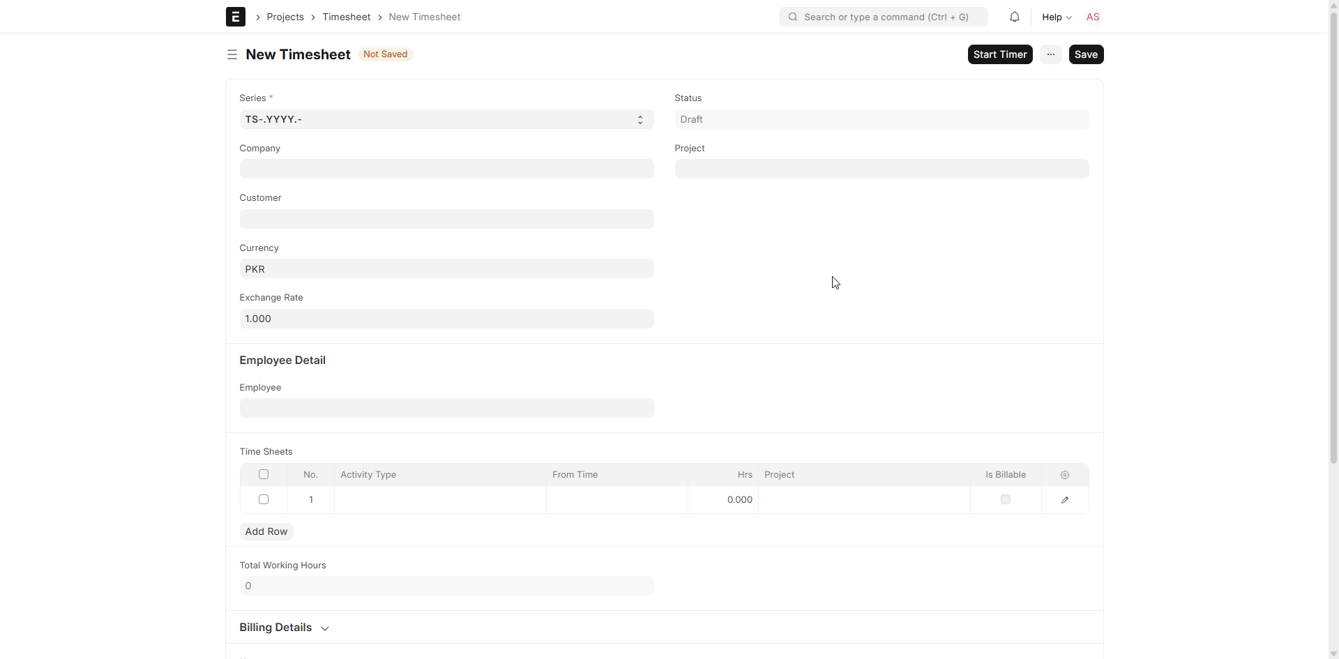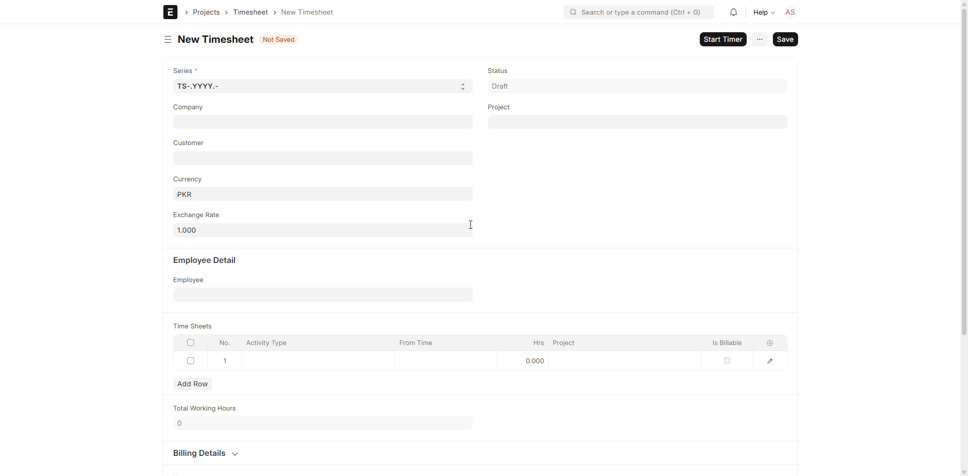 Series: The Series field in the Timesheet specifies how the document will be named. ERPNext applies this to automatically generate a distinctive number (e.g., TS-0001) for a new Timesheet based on the chosen naming series.
