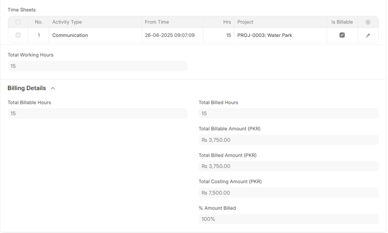 The Time Sheet, if you open it up, you are able to input some very important details that add more tracking, costing, and billing features. More powerful validations and automations have been added in ERPNext v15 to enable more accurate project costing and time tracking.