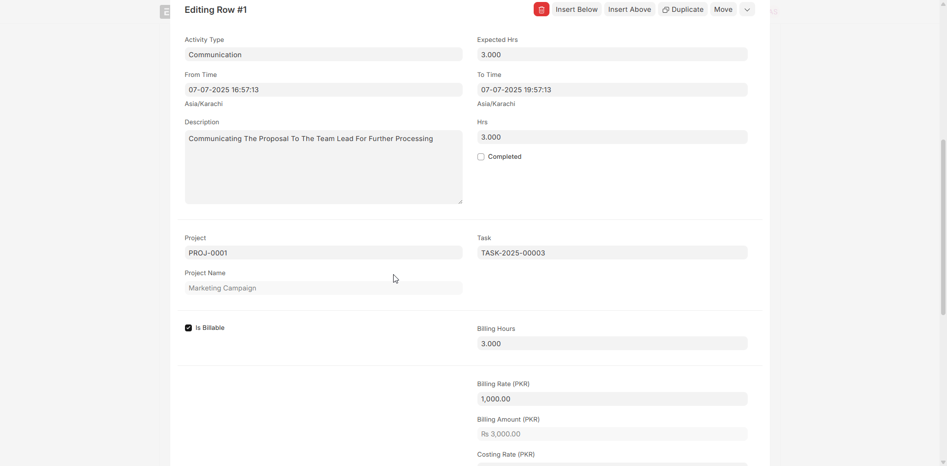 - The form will have the Task, Project, and Employee fields filled in by context.