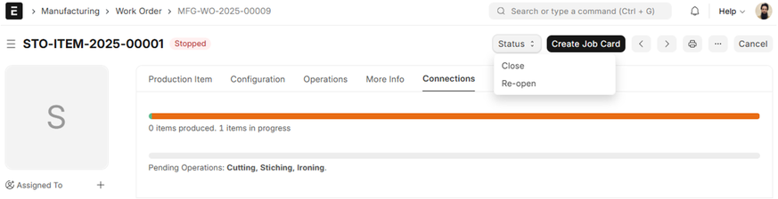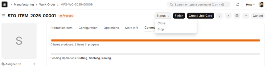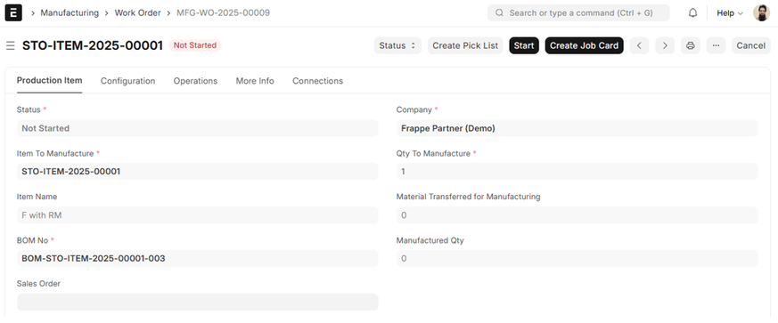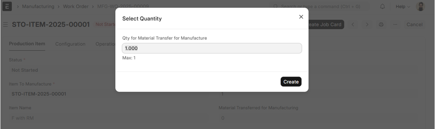 1. Click ‘Start’ This results in the creation of Job Cards for each operation included in the Work Order. Job Cards are necessary to track shop floor execution and operation-wise progress.