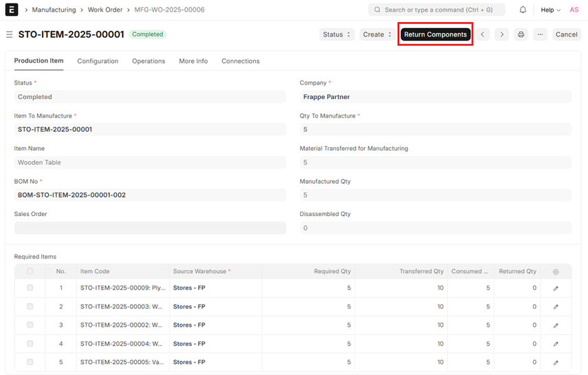 Note: The Return Components option only appears once the Work Order is finalized or when there’s excess quantity found in the WIP Warehouse.