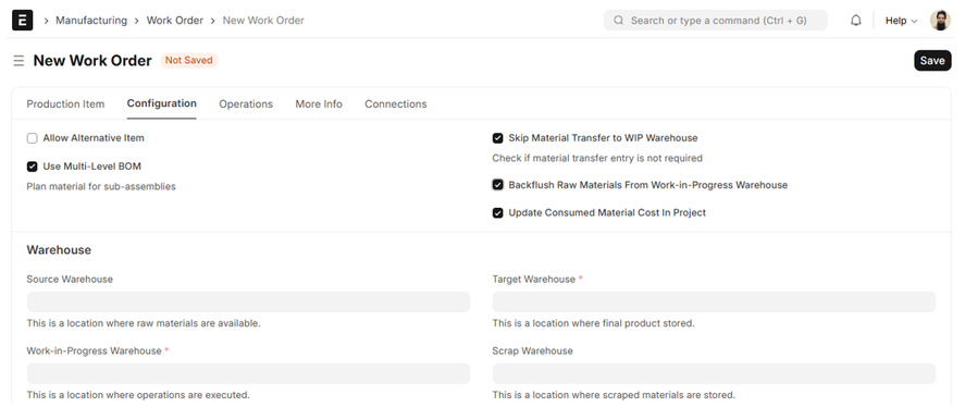 Backflush Raw Materials From Work-in-Progress Warehouse: If you turn on this checkbox, ERPNext creates a Stock Entry with the status Manufacture automatically. Such an operation implies the consumption of raw materials from the Source Warehouse, processing into finished goods, and shipping to the Target Warehouse. Backflushing assists in inventory consumption automation, as raw materials are properly debited from stock as the product flows into WIP or finished status.