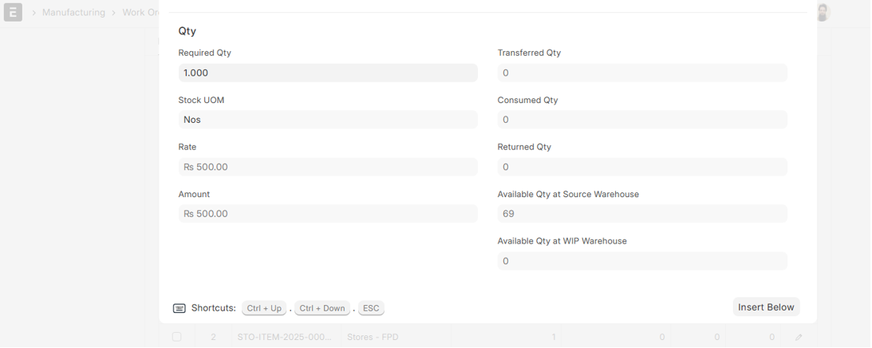 • Available Qty at WIP Warehouse: Displays the present stock of the item in the Work In Progress warehouse.