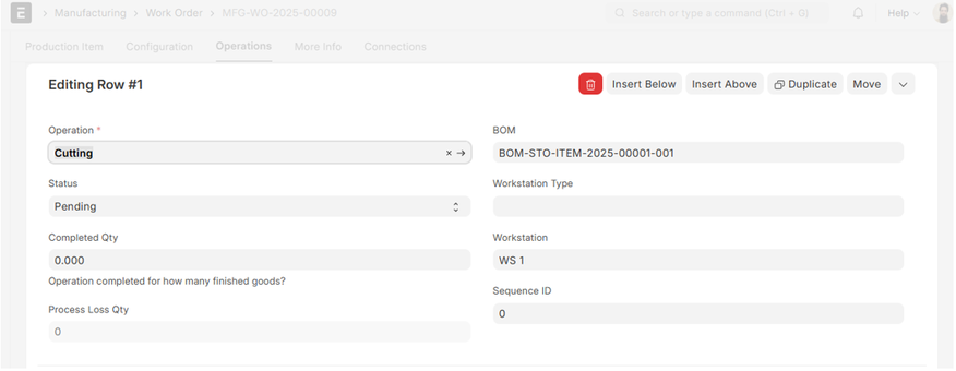 • Operation: The operation type to be carried out (e.g., Cutting, Assembling).