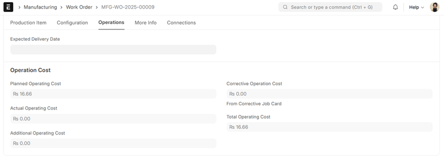 The Operation Cost field in a Work Order provides an overview of the cost structure on the basis of operations and actual performance from the floor.