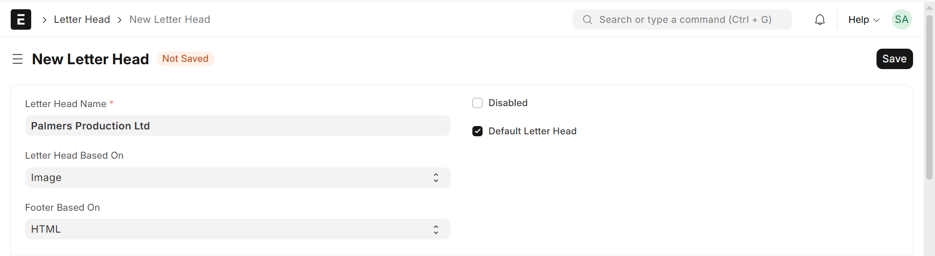 - When checked, this becomes the default letter head for all documents (Sales Invoice, Quotation, PO, etc).