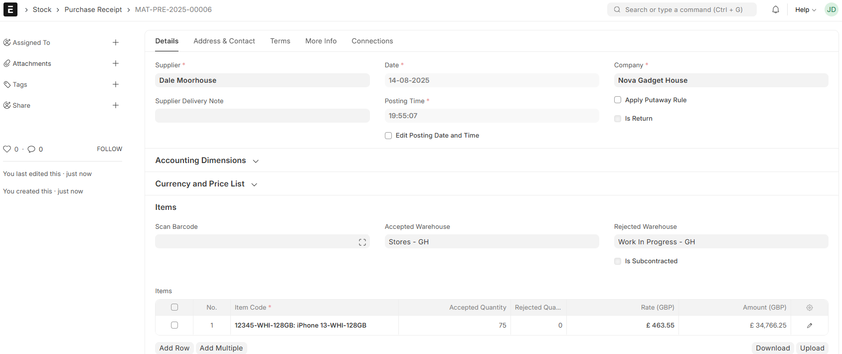 A Purchase Receipt is generated when you receive goods from your supplier, typically against a Purchase Order. It updates the stock ledger and tracks the accepted and rejected quantities and warehouse locations.