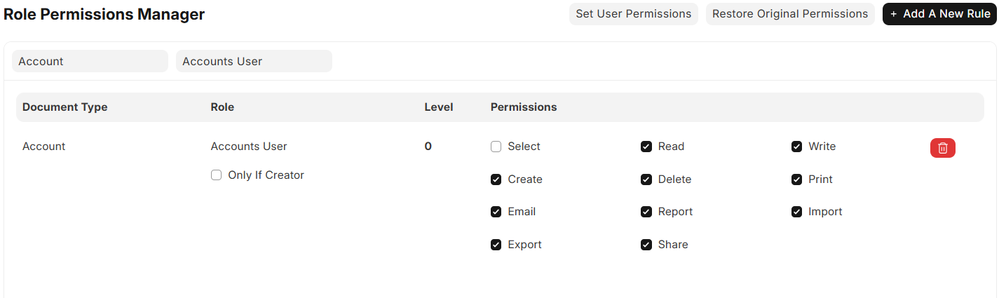 What a user is able to do and what documents they can see in ERPNext is controlled by their role. ERPNext’s permission system revolves around roles, each one of which has an associated set of permissions that can be controlled using the Role Permission Manager. Accounts User, Sales User, HR Manager, and other pre-defined common roles are available by default in ERPNext. You can immediately use these or define new ones depending on the requirements of your organization.