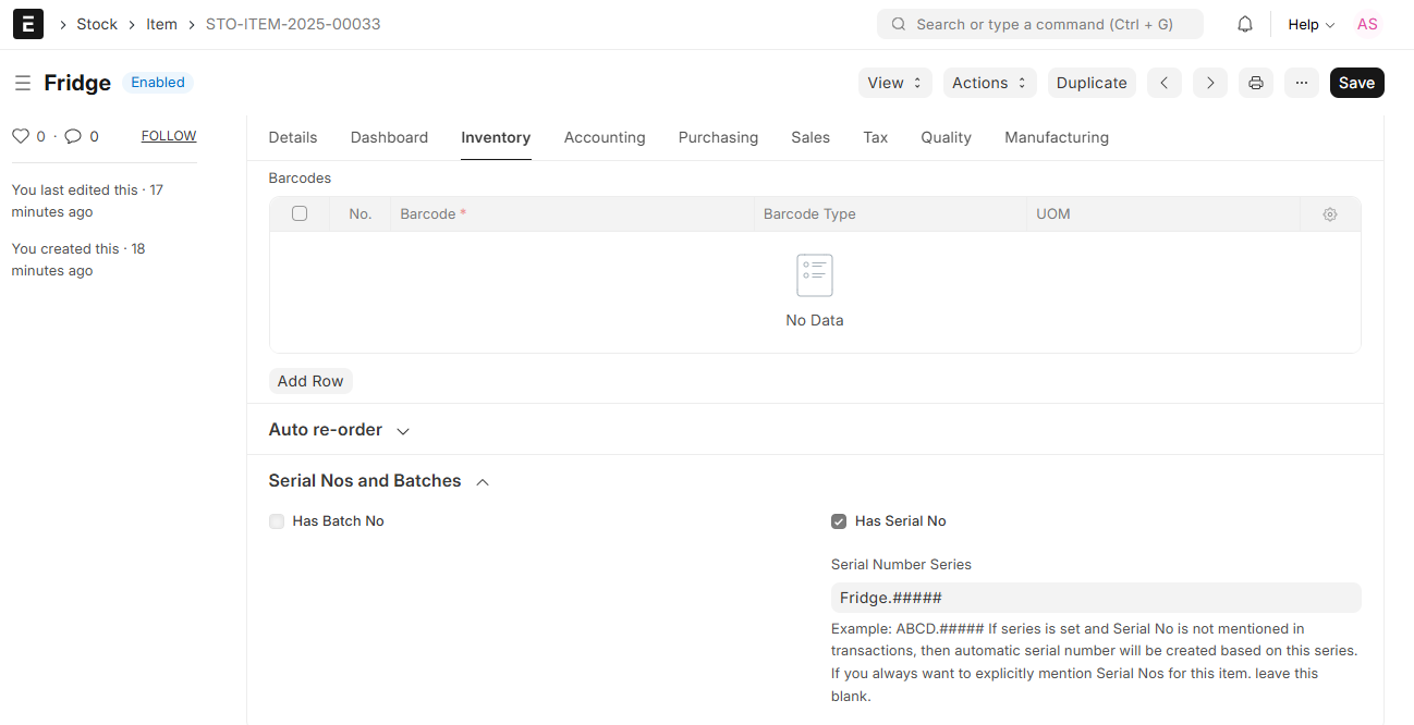 4. Note: If a transaction has previously been effected using that Item, the “Has Serial No” field in the Item cannot be switched.